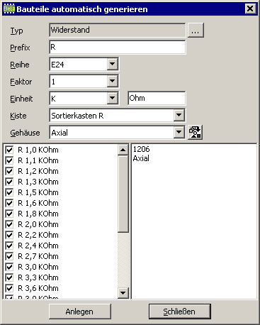 Als erstes muss der Typ ausgewählt werden. Mit Prefix werden alle Buchstaben für den Start eingegeben. Die Reihe definiert die E-Reihen E3, E6, E12, E24, E48, E96, E192 und auch 0..9 oder 0..99. Mit dem Faktor kann der Wert der Reihe *1 oder *10 oder *100 gerechnet werden. Die Einheit kann von p (Piko) ... G (Giga) oder nichts ausgewählt werden. Neben der Einheit ist ein freies Text-Feld in der Zusätze eingegeben werden können. Mit Kiste kann festegelgt werden ob gleich ein "Kiste/Lager" Eintrag mit erzeugt wird. Die Fachposition muss nachträglich ausgefüllt werden. Damit erspart man sich zumindest das Anlegen eines neuen Datensatzes sowie die Auswahl der Kiste. Alle gewählte Gehäuse erhalten dann diesen Kiste Eintrag. Mit Gehäuse wird eines
