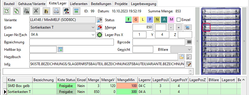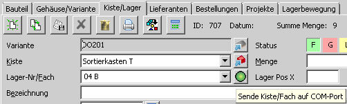 Die Summe aller Mengen der Gehäuse/Varianteneinträge von dem einen ausgewählten Bauteil ist in der Text-Anzeige "Summe Menge:" rechts neben dem "Datum:" ersichtlich. Mit dem Status kann der Status der Lagerposition festgelegt werden.