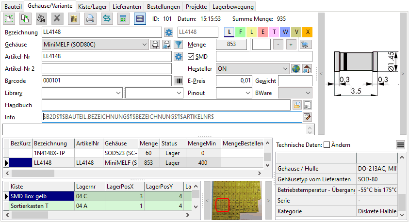 wurden. Mit der Der Link zum "Handbuch" kann eine Datei sein oder man kann auch eine Internet-Adresse angeben, dabei muss ein "http://" oder ein "https://" voran stehen. Mehr kann unter "Allgemeine Infos" nachgelesen werden. Im Eingabefeld unterhalb von Handbuch kann ein Beschreibungstext eingegeben werden. Wenn um den Artikel in die Bestell-Vorschlagliste in diesem Reiter die "Warenkorb-Taste" gedrückt wird, dann wird automatisch auch die Information "Gehäuse/Variante" im Bestellvorschlag gespeichert. Damit wäre bei Status "geliefert" ein "buchen in Lager" mit automatischer Mengen-Korrektur möglich. In der Tabelle ist ein zusätzliches Eingabefeld "MengeMin". Sobald dies eingetragen ist wird es farblich hinterlegt bei Mengen-Unterschreitung. Unter "Bestellung" können diese Artikel mit Hilfe der Funktion "Bauteile mit Min-Menge unterschritten" in die Bestell-Vorschlagliste übernommen werden. Das Feld wird nur in der Tabelle eingegeben. Das Feld "MengeBestellen" ist die Default-Vorgabe wenn ein Bauteil bestellt werden soll wie viel Stück davon gekauft werden sollten. Neben dem Häkchen "SMD" ist ein Eingabefeld für den SMD Marking-Code Aufdruck. Viele kleine Bauteile habe nur einen Marking-Code aufgedruckt anstatt der Typbezeichnung, dieser kann hier eingetragen werden. Sollte ein Bauteil mehrere unterschiedliche Marking-Codes haben, so können diese mit Semikolon ";" getrennt eingegeben werden. Unter "Extras > Rechner" werden alle Bauteile gefunden, die in diesem Eingabefeld hinterlegt werden. Das Feld "BWare" definiert welchen Zustand das Bauteil hat. Bei Anwahl öffnet sich eine Liste in der man zwischen Neu, 2. Wahl, gebraucht, unbrauchbar und defekt auswählen kann. In der Tabelle ist ein zusätzliches Eingabefeld "RoHS".