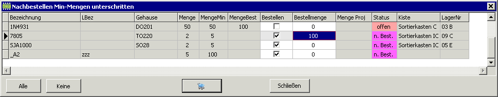 Einträge mit dem Kennzeichen "eingelagert" werden nicht gezeigt. Wenn ein Bauteil bereits in der "Bestellung" Liste mehrfach existiert und unterschiedlichen Status hat, so werden diese auch in dieser Tabelle angezeigt. Die Min-Menge und Menge eines Bauteils werden unter "Bauteil-F2" > "Gehäuse/Variante" eingegeben. |