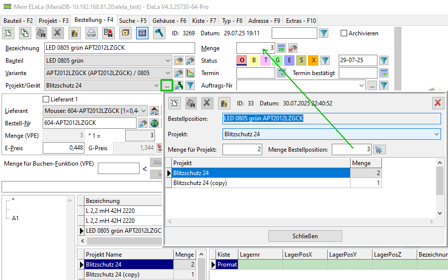 Bestellung - ProjektzuordnungZu einer Bestellposition kann EleLa mehrere Projekte zuordnen. Wenn man aus dem Projekt heraus mit "Prüfe Menge für Produktion" mehrere Projekte auswählt, so werden die Mengen entsprechend den gewählten Projekten zugeordnet. Manuell kann diese Zuordnung bei Bestellung-F4 geändert werden: