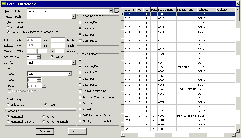 Über die "Gruppierung anhand" wird bestimmt welche Bauteile auf ein Etikett zusammen gefasst wereden sollen. Somit lässt sich bestimmen welche Bauteile alle auf ein Etikett erscheinen. Bei einem Werkstattmagazin verwendet man in der Regel Lager Pos X und Y. Wenn Unterteilungen innerhalb eines Faches sind so können diese mit "Lager Pos Z" für jede Unterteilung separat gedruckt werden.