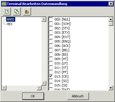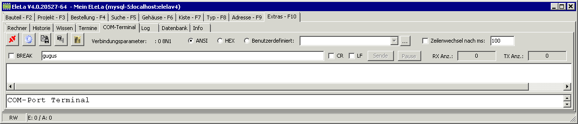 Extra TerminalMit dem Terminal kann man Daten einer seriellen Schnittstelle aufzeichnen und Daten senden. Die Darstellung der empfangenen Zeichen kann umgeschaltet und auch benutzerdefiniert eingestellt werden.
