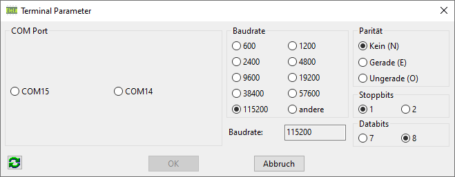man die Entfernen-Taste. Der untere Abschnitt zeigt alle empfangene Zeichen von der seriellen Schnittstelle, gewandelt anhand der Datenwandlung. Alle Einstellungen werden bei Beenden von EleLa lokal gespeichert so dass diese beim nächsten Öffnen wieder verfügbar sind. Parameter der seriellen Schnittstelle einstellenDie Taste "Parameter" in der ersten Zeile öffnet diesen Dialog: