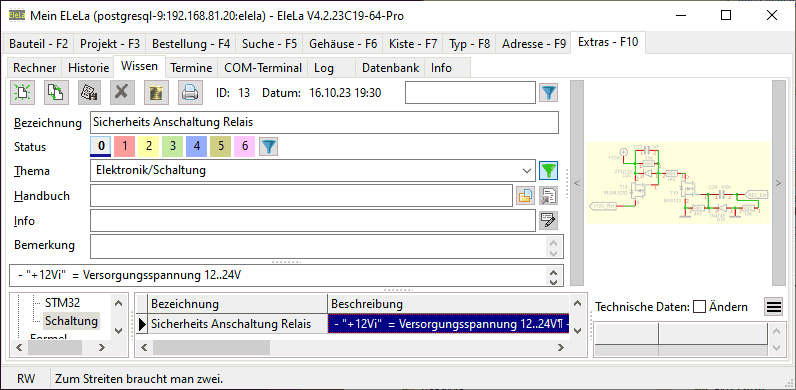 werden. Rechts neben der Tabelle können zum Wissens-Eintrag diverse zusätzliche Werte, Parameter und Infos in tabellarischer Form eingegeben werden. Mit der "Y" Taste