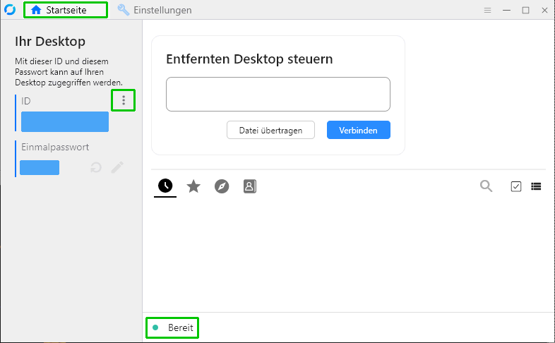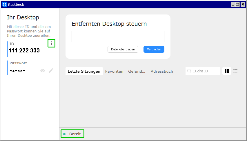 Nachdem der Verbindungsserver korrekt eingetragen und mit OK bestätigt wurde zeigt RustDesk ob die Verbindung "Bereit" ist indem der kleine Punkt im unteren Bereich grün wird: