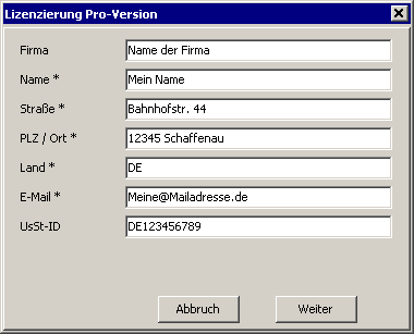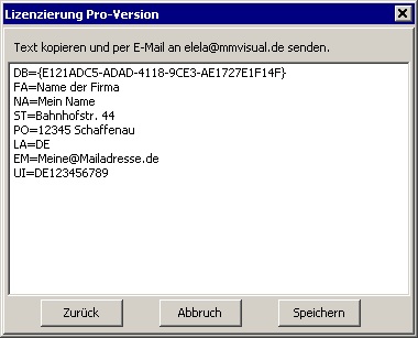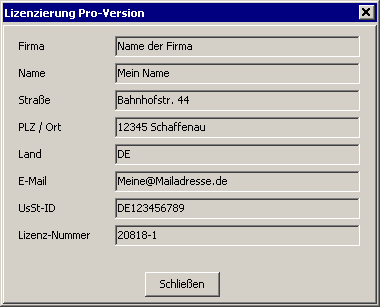 Eine Lizenzierung ist immer für eine Firma oder eine Person gültig und darf dritten nicht zur Verfügung gestellt werden. Unterschiede Freeware / Pro Version. Beantragung der LizenzUnter Extras-F10 > Info > Taste "Pro Lizenzierung"