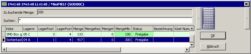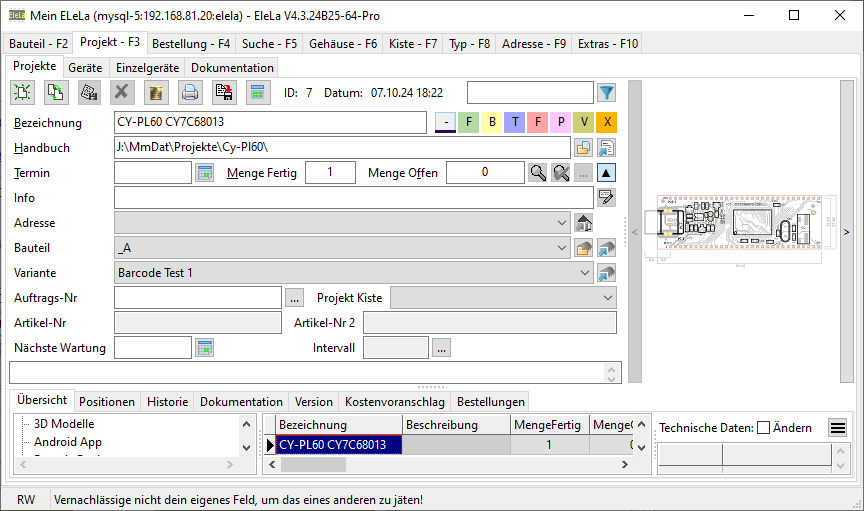 werden. Bauteil / Variante: Nach Produktion des Projektes wird diesem Bauteil der Lagerbestand erhöht. Die Funktion und wie man es einrichtet ist hier beschrieben. In der Spalte "Variante" wird die Bestückungsvariante gespeichert, die man unter Projekt auswählt. Darin werden die Varianten mit "|" getrennt abgelegt. Wenn man viele Varianten ausgewählt hat und schnell alle weg haben möchte, so kann dieses Feld in der Tabelle geleert werden. In der Spalte "Kiste" kann dem Projekt eine Projektkiste zugeordnet werden. In dieser Kiste können alle Teile für das Projekt "gesammelt" werden und wenn das Projekt gefertigt wird können die Teile von dieser Kiste entnommen werden. Die Projektkiste wird unter "Kiste-F7" angelegt und kann gleich verwendet werden wie andere Lagerpläte/Kisten. Bei der Lagerbuchung kann man zusätzlich wählen dass die "Projektkiste" zur Bauteilauswahl bevorzugt verwendet werden soll. Rechts neben der Tabelle können diverse zusätzliche Werte, Parameter und Infos in tabellarischer Form eingegeben werden. Doppelklick in der Tabelle oder dem Projektbaum öffnet die Positionen. Funktion Prüfe Menge nach ProduktionMit der Funktion kann man den Bestand prüfen ob alle Bauteile auch