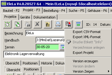 Die SQLite Datei für den Export kann für mehrere Projekte ausgewählt werden, dann werden mehrere Projekte in eine Datei exportiert. Wenn Änderungen erfolgt sind so wird dies nicht in der Export-Datei überschrieben/aktualisiert, dann muss in eine neue leere Datei exportiert werden. Dieser Export kann nicht ein eine andere EleLa Datenbank importiert werden. Mit "Einzelgeräte erzeugen" können aus einem gefertigten Projekt/Gerät Einzelgeräte erzeugt werden um diese einzeln mit Seriennummer zu versehen. Damit kann jedes einzelne gefertigte Projekt / Gerät dokumentiert werden. Mit "Einzelgeräte zeigen" wird zur Einzelgeräteansicht gesprungen und es werden die Einzelgeräte des ausgewählten Projektes oder Gerätes gefiltert gezeigt. Projekt verschieben zu Gerät: Mit dieser Funktion kann ein Projekt zum Gerät verschoben werden. Dabei werden alle Versionen zum Gerät verschoben. Sollte das Projekt ein Unterprojekt (links im Baum) sein, so wird dies gelöscht, da der Geräte-Baum ein anderer ist. In dem Fall müsste das verschobene Projekt wieder neu in das entsprechende Unterprojekt verschoben werden. Projekt VersionierenWenn ein Projektstand fixiert werden soll, so kann das Projekt versioniert werden. Damit wird es für Änderungen gesperrt und man kann weder das Projekt noch die Positionen ändern.