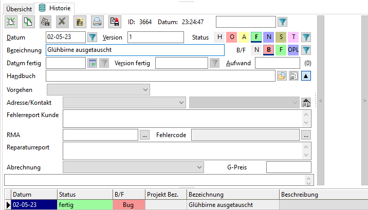 Der Reiter zeigt an ob bei Historie Einträge hinterlegt sind. Datum, von wann der Eintrag kommt. Version bei der dies festgestellt wurde. Status: