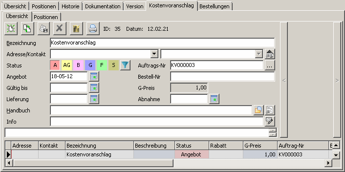 In der Übersicht werden Kunde (Adresse / Kontakt) sowie Termine eingetragen. Die Bezeichnung muss eindeutig sein. Status: