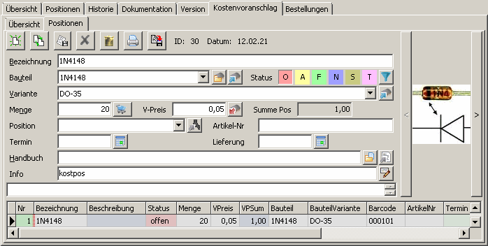 Die Positionen können mit einem Bauteil und Gehäuse/Variante verbunden werden wobei automatisch der V-Preis aktualisiert wird. Jede Position kann mit einer Position aus den Projektpositionen verbunden werden um einen Verweis zum Projekt her zu stellen. Der V-Preis wird aus dem Bauteil Gehäuse/Variante verwendet, sobald ein Bauteil zugewiesen wird. Status: