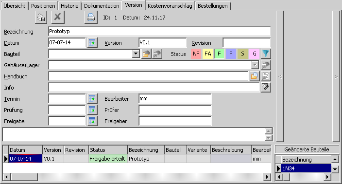 Einträge können aus dieser Liste nicht gelöscht werden. Mit dem Status der Freigabe wird gezeigt welcher Stand gefertigt werden darf. Status: