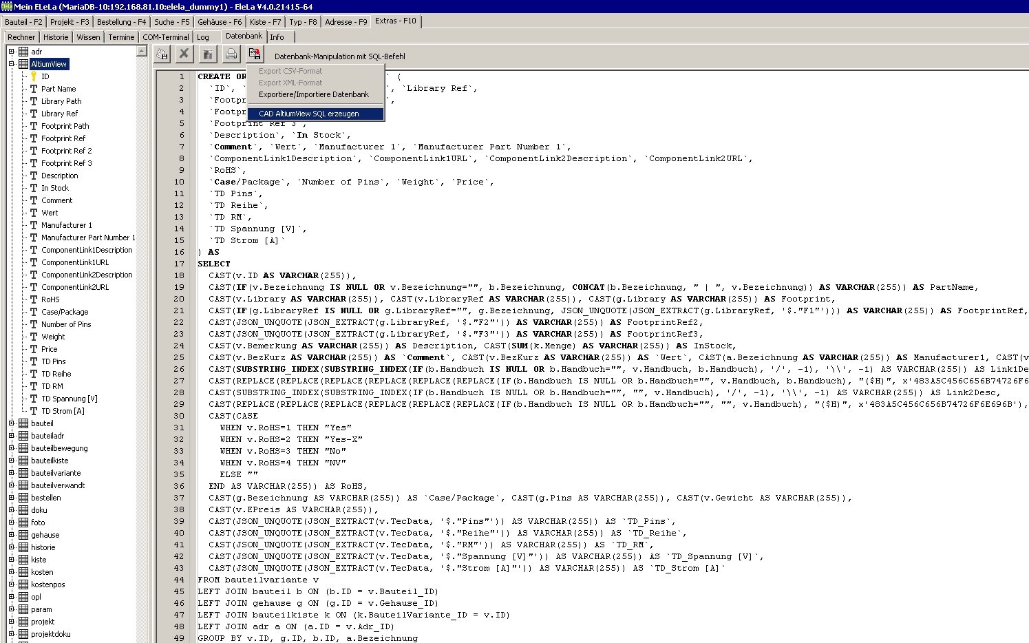 EleLa kann den SQL Befehl für MySQL/MariaDB unter "Extras-F10"