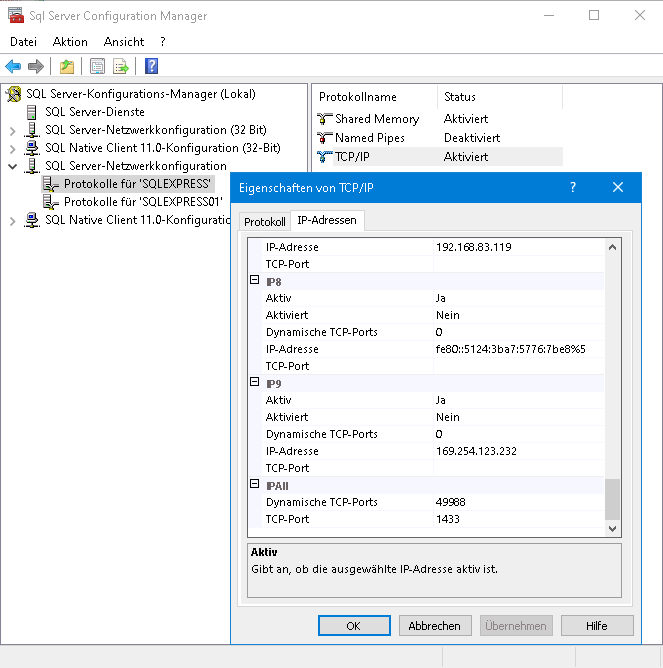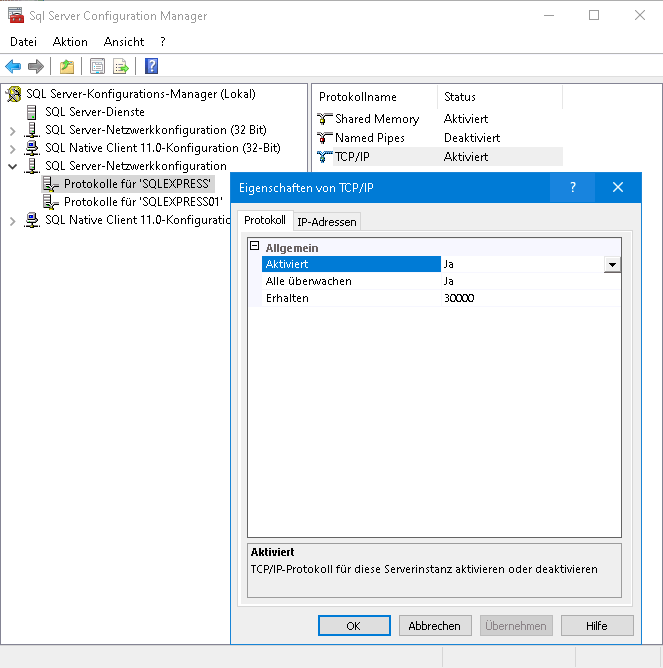 Im Abschnitt SQL Server-Netzwerkkonfiguration muss "TCP/IP"