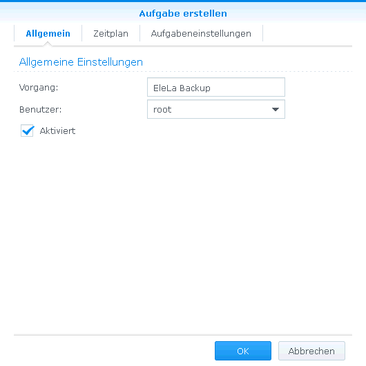 Synology DiscStation Tutorial - Einrichten EleLaBackup der MariaDB DatenbankDieses Tutorial zeigt wie man bei einer Synology Discstation ein automatisches Backup der MariaDB Datenbank mit EleLaBackup einrichtet, so dass per Aufgabenplaner die EleLa Datenbanken sichert. Da die Linux-EXE "EleLa" nicht auf der DiscStation ausführbar ist wird das Tool "EleLaBackup.64" verwendet. Die Sicherung wird über einen Script gestartet, der Script kann mittels Aufgabenplater aktiviert werden. Benötigte Vorbereitung:In der Freigabe "allgem" ist der Ordner EleLa mit den benötigten