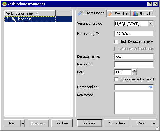 Host/IP: Die Adresse des Servers. Beim gleichen PC ist das localhost